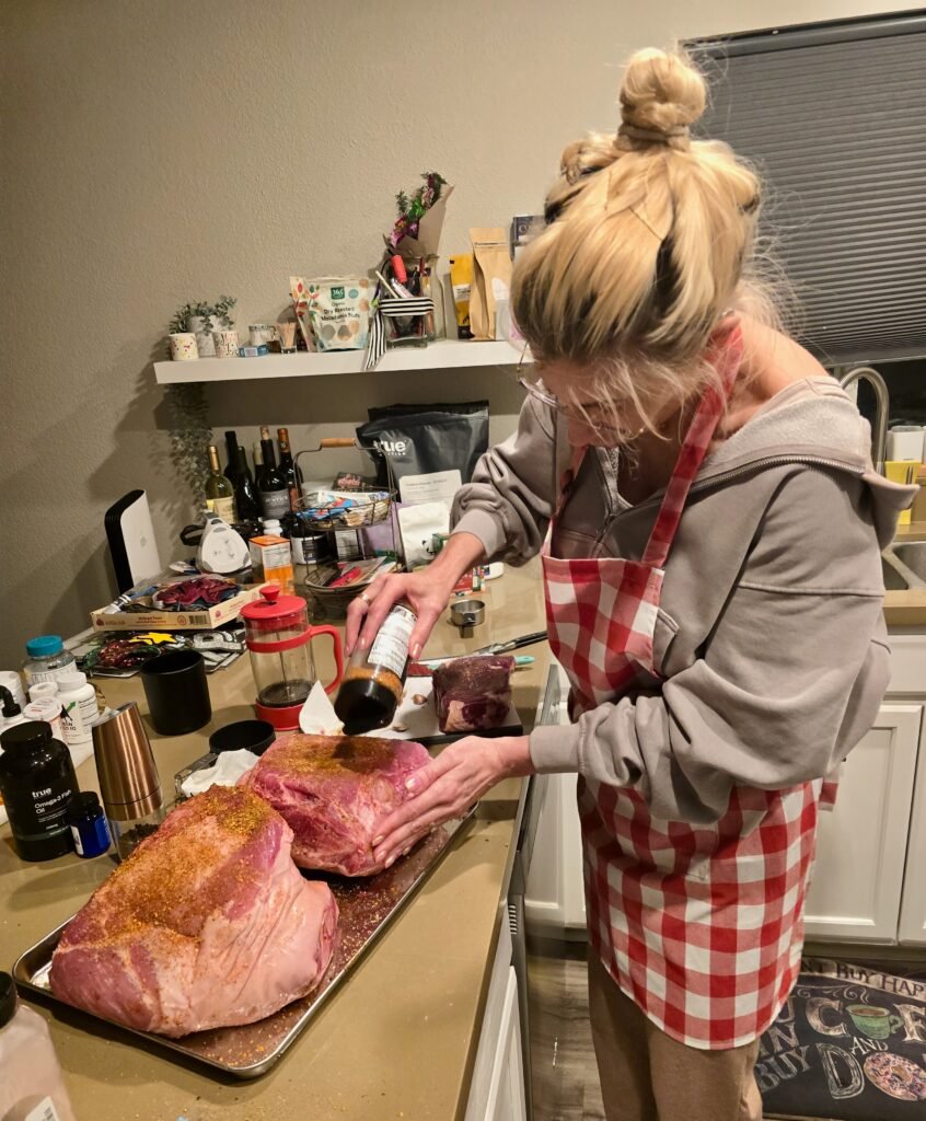 Angel brought over 2 big pork butts for me to smoke. They turned out superb if I may brag a little 🙂 Hunter loves fresh meat (and smoked) and he concurs!