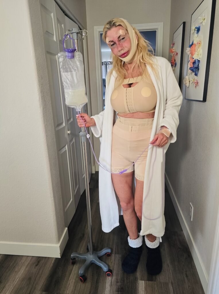 The biggest happening this week was my ‘fix-it-all’ surgery. Face, boobies, abs & butt. Might as well suffer through it all at once! Here’s some pics a few hours after I got home and a video!